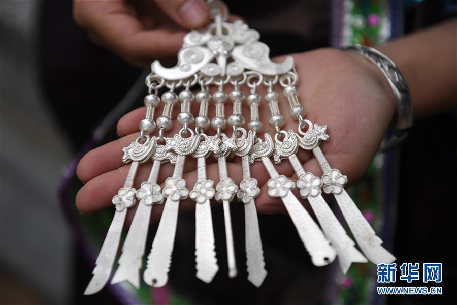 5月29日,在廣西融水苗族自治縣融水鎮(zhèn),一名女青年在展示一款苗族銀飾。