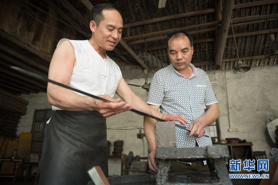 5月21日,鄭國榮在“古越劍鋪”向徒弟們傳授寶劍淬火技藝。 新華社記者 翁忻旸 攝