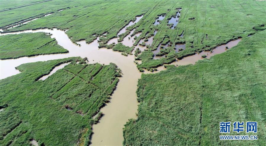 這是天津市寧河區(qū)七里海濕地內(nèi)蘆葦和水面形成的圖案(6月22日無人機拍攝)。