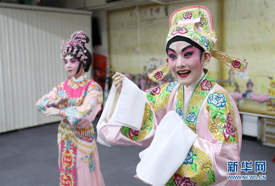 陸瑞徽(左)和利文喆在表演折子戲《艷曲醉周郎》(6月8日攝)。 聲輝粵劇推廣協(xié)會(huì)成立于2003年,是香港重要粵劇藝術(shù)團(tuán)體之一,致力于向青少年推廣粵劇。協(xié)會(huì)目前有兩個(gè)初班,3個(gè)中班,一個(gè)青少年班?;泟∮址Q“廣東大戲”,表演技藝包括“唱做念打”,即唱功、身段、臺(tái)詞、武打,主要流行于廣東、廣西和香港、澳門等地區(qū)。2009年,粵劇被列入聯(lián)合國(guó)教科文組織人類非物質(zhì)文化遺產(chǎn)代表作名錄,今年正逢十周年。 新華社記者 吳曉初 攝