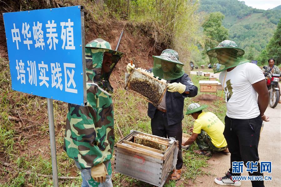 在云南省西盟縣勐梭鎮(zhèn)班母村中華蜂養(yǎng)殖基地,村民在學(xué)習(xí)養(yǎng)蜂技術(shù)(6月16日攝)。 精準(zhǔn)扶貧的春風(fēng),吹到了西南邊疆。在云南省西盟縣的拉祜山寨,人們告別了吃不飽、穿不暖、沒有安全住房的日子。學(xué)習(xí)先進(jìn)技術(shù),改變精神面貌,發(fā)展養(yǎng)蜜蜂、種甘蔗等甜蜜產(chǎn)業(yè),拉祜人的日子越過(guò)越甜。 新華社記者 秦晴 攝