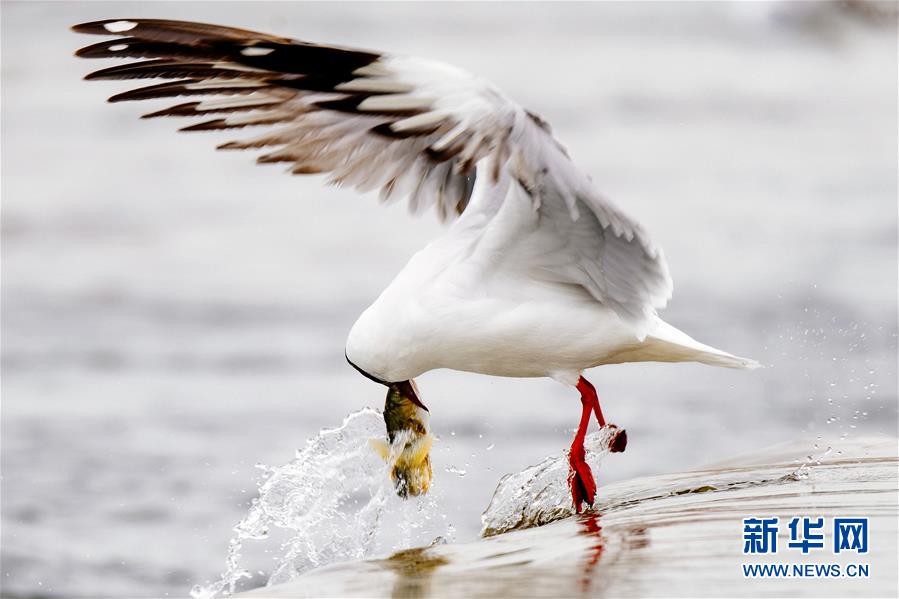 7月6日,在青海省剛察縣沙柳河,一只棕頭鷗捕捉到一只湟魚后飛離水面。 新華社記者 費(fèi)茂華攝