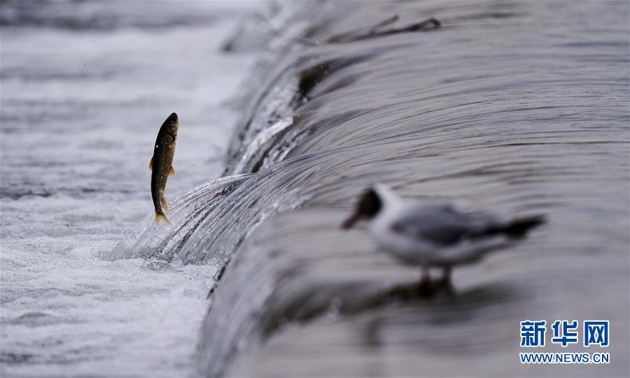 7月6日,在青海省剛察縣沙柳河里,一只棕頭鷗捕捉到一只躍起的湟魚。 新華社記者 吳剛攝