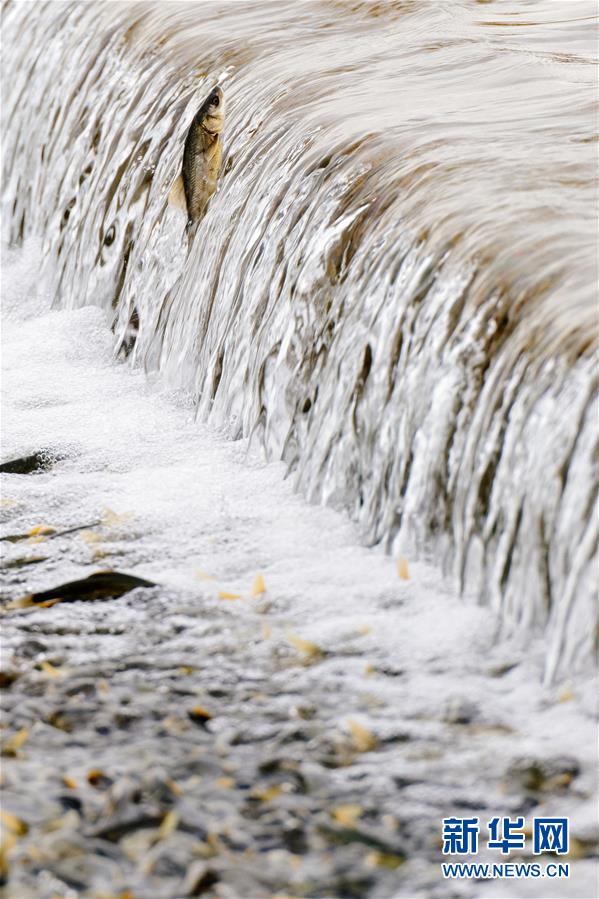 7月6日,在青海省剛察縣沙柳河里,一只湟魚躍起向上洄游。 新華社記者 費(fèi)茂華攝