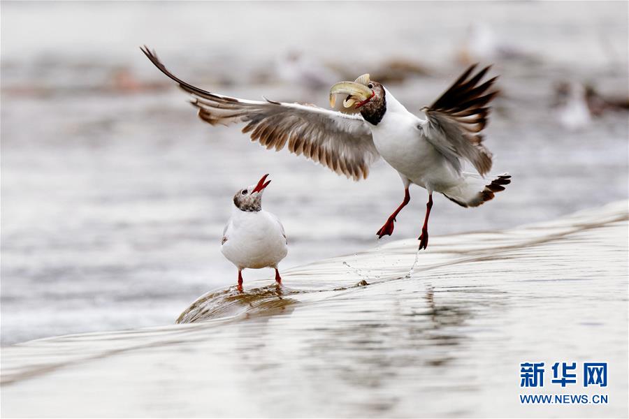 7月6日,在青海省剛察縣沙柳河里,一只棕頭鷗捕捉到一只躍起的湟魚(yú)。 新華社記者 劉金海攝