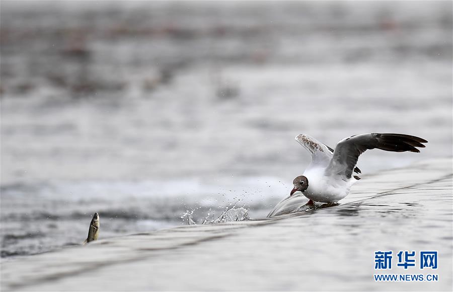 7月6日,在青海省剛察縣沙柳河里,一只棕頭鷗在覓食。 新華社記者 張宏祥攝