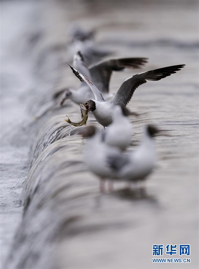 7月6日,在青海省剛察縣沙柳河里,幾只棕頭鷗在捕捉躍起的湟魚。 新華社記者 費茂華攝