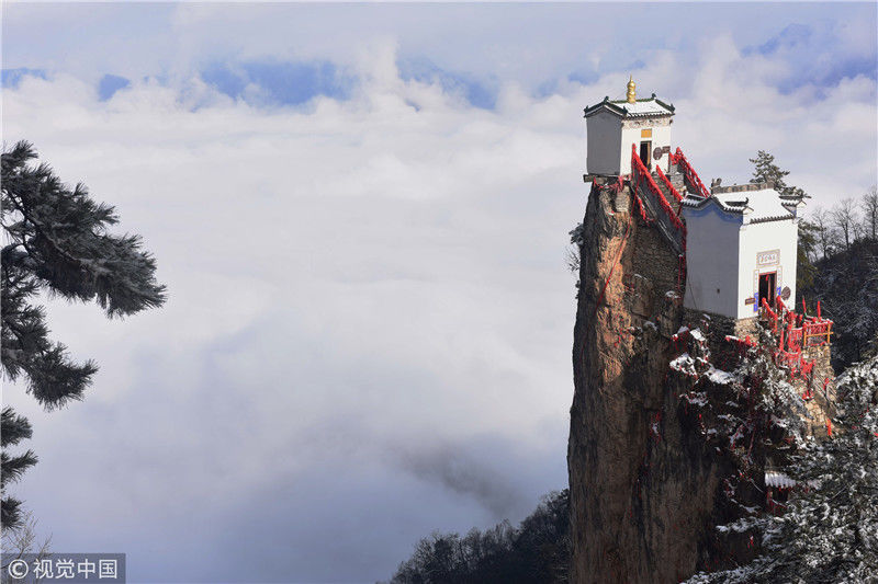 3月3日拍攝的塔云山金頂觀音殿。雪后初霽,秦嶺深處的塔云山景區(qū)云海翻騰,宛如仙境。位于陜西省鎮(zhèn)安縣柴坪鎮(zhèn)境內(nèi)的塔云山,其主峰上的古建筑群始建于明正德年間,其中金頂觀音殿建于塔云山萬仞絕頂之上,遠(yuǎn)遠(yuǎn)望去,壯觀無比。 新華社記者陶明攝