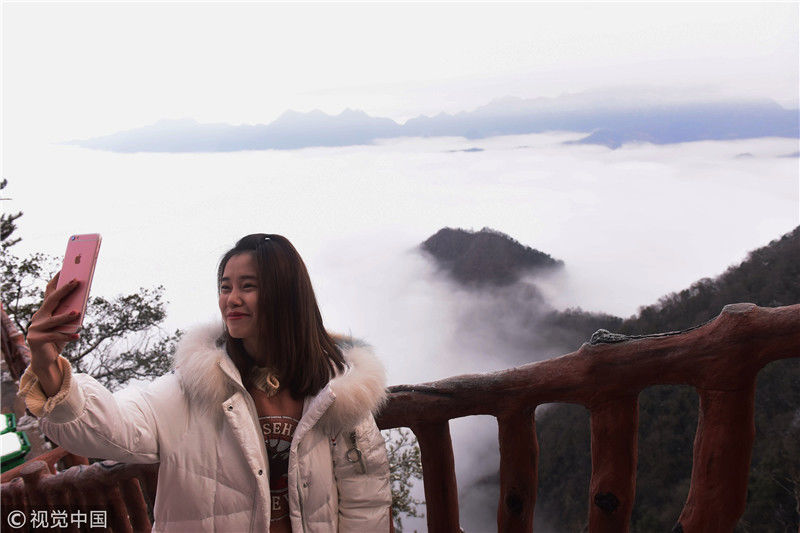2019年3月3日,陜西商洛,位于鎮(zhèn)安縣的塔云山景區(qū)云海翻騰,宛如仙境。袁景智/視覺中國 編輯/陳進(jìn)