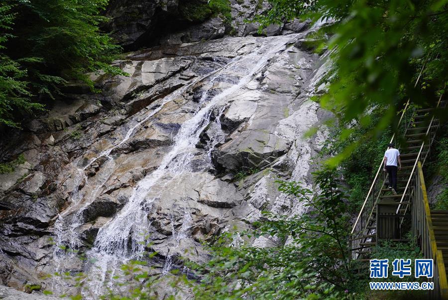 7月10日,游客在太白縣青峰峽景區(qū)游覽。 陜西太白縣青峰峽國家級森林公園位于秦嶺主峰太白山北麓,這里青山疊嶂,瀑布穿流,氣候涼爽,年平均氣溫7.6攝氏度,成為炎炎夏日中人們避暑休閑的好去處。 新華社記者 邵瑞 攝