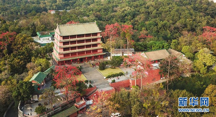 盛開的木棉花和坐落在廣州越秀山上的鎮(zhèn)海樓交相輝映(2月22日無人機(jī)拍攝)。 新華社記者 鄧華 攝
