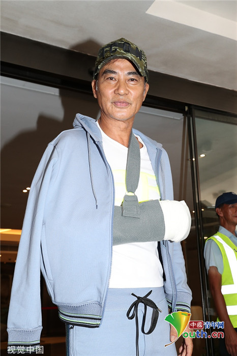 2019年7月24日,香港,任達(dá)華出院。他身穿藍(lán)色運動外套走出醫(yī)院,頭戴鴨舌帽,受傷的右手則套上白色護(hù)臂帶,面帶笑容,精神狀態(tài)非常好。
