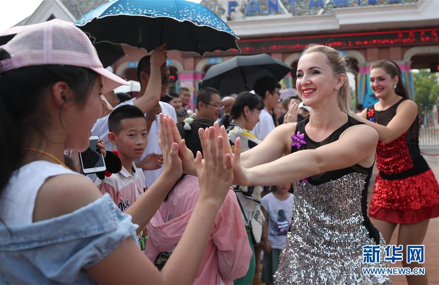 7月31日,列娜(前排左)在沈陽(yáng)方特歡樂世界門前表演舞蹈。