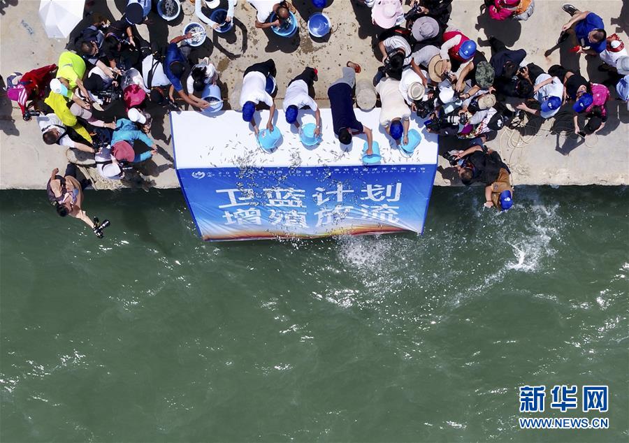 8月3日,首屆福清開漁節(jié)增殖放流活動(dòng)上人們?cè)谙虼蠛M斗鹏~苗(無(wú)人機(jī)拍攝)。