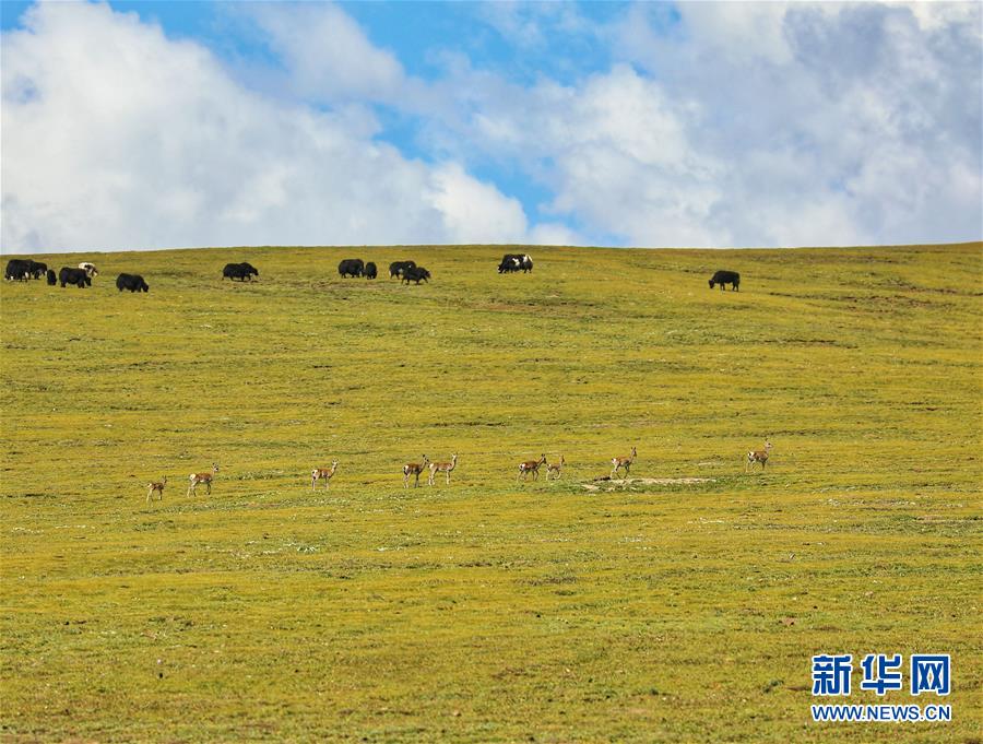 一群藏原羚在牦牛群旁駐足吃草(8月14日攝)。 8月12日至14日,來(lái)自全國(guó)各地的31名自然愛好者聚集在海拔4200米的青海省玉樹藏族自治州稱多縣嘉塘草原,參加“2019嘉塘自然觀察節(jié)”。自然愛好者用獨(dú)特視角記錄珍稀野生動(dòng)植物,觀察三江源生態(tài)。 新華社記者 田文杰 攝