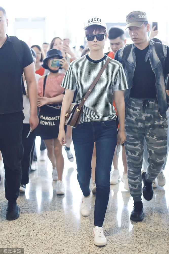 她身穿條紋T恤搭配牛仔褲,青春活力。頭戴棒球帽,黑超遮面,又不失酷感。