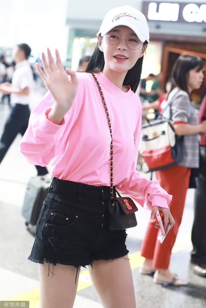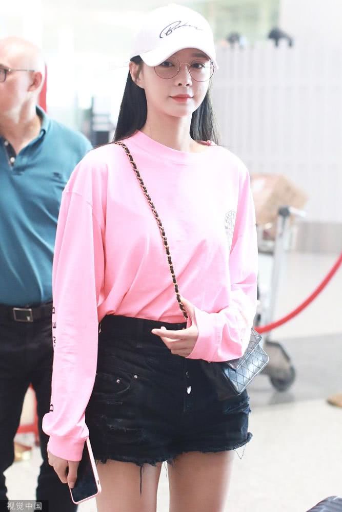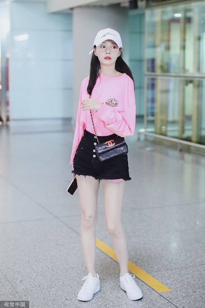 她戴著棒球帽身穿粉色衛(wèi)衣搭配熱褲,長腿纖細又白嫩。