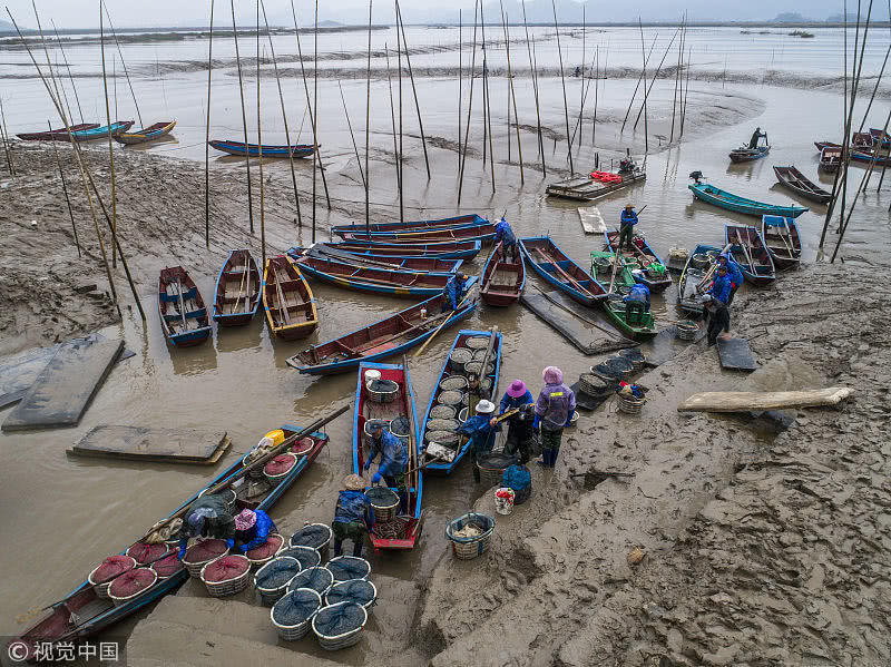 9月23日,漁民在捕撈牡蠣(無(wú)人機(jī)拍攝)。