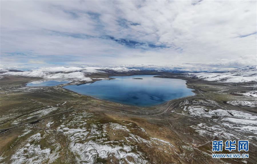 9月24日無人機拍攝的拿日雍錯。拿日雍錯位于西藏山南市錯那縣北部,海拔4900米,像藍(lán)寶石般鑲嵌在雪山草原之間。新華社記者晉美多吉攝