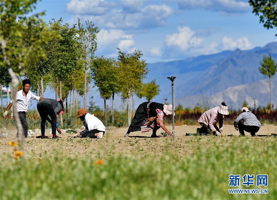 當(dāng)?shù)厝罕娫谏侥鲜性铱h藏草萬(wàn)畝植物種苗繁育基地勞動(dòng)(8月29日攝)。 新華社記者 張汝鋒 攝