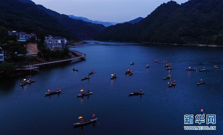 9月25日,在宋村鄉(xiāng)云源港的水面上,漁民劃著漁船,船頭點亮漁燈,構(gòu)成一幅“漁舟唱晚、萬家燈火”的美麗圖景(無人機拍攝)。 近年來,浙江省杭州市淳安縣宋村鄉(xiāng)積極發(fā)展鄉(xiāng)村旅游,打造漁家元素特色景觀,助力鄉(xiāng)村振興建設。目前,宋村鄉(xiāng)依托山水景觀和漁家文化,帶動了當?shù)鼐访袼藓图碁╂宜?、自助燒烤、農(nóng)事體驗、民俗攝影采風為一體的特色旅游發(fā)展。2019年1月初至7月底,全鄉(xiāng)接待游客10萬人次,實現(xiàn)旅游經(jīng)濟收入1300萬元。 新華社記者 徐昱 攝