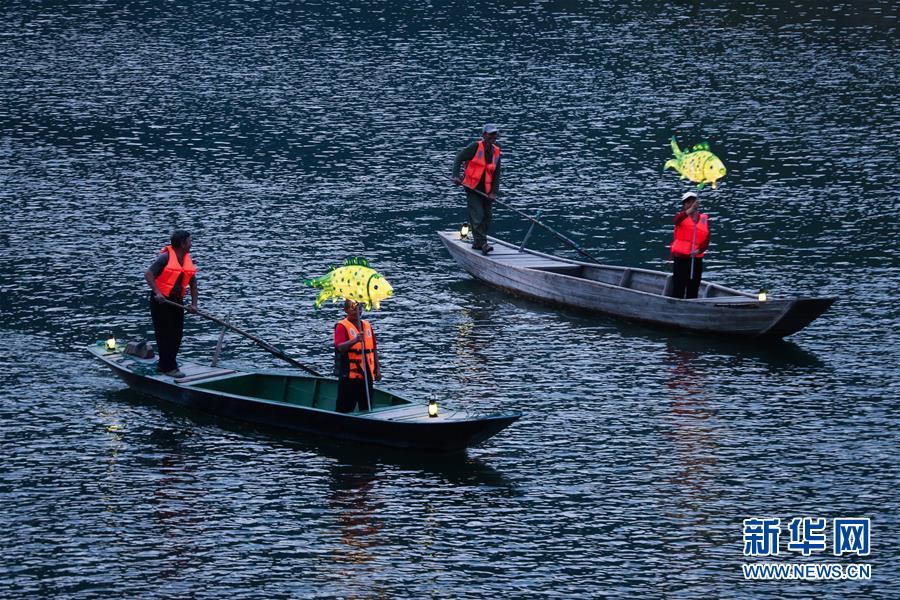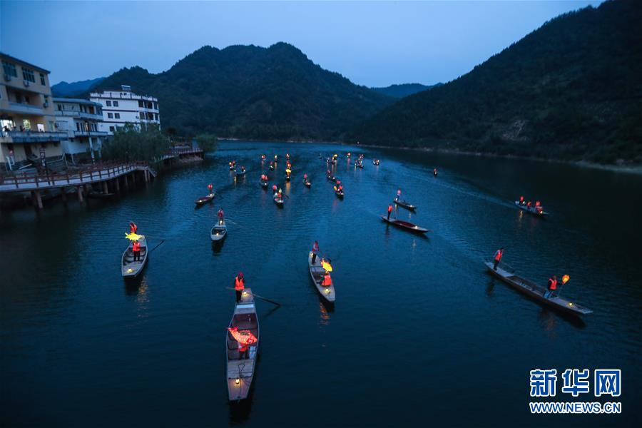 9月25日,在宋村鄉(xiāng)云源港的水面上,漁民劃著漁船,船頭點(diǎn)亮漁燈,構(gòu)成一幅“漁舟唱晚、萬家燈火”的美麗圖景(無人機(jī)拍攝)。 近年來,浙江省杭州市淳安縣宋村鄉(xiāng)積極發(fā)展鄉(xiāng)村旅游,打造漁家元素特色景觀,助力鄉(xiāng)村振興建設(shè)。目前,宋村鄉(xiāng)依托山水景觀和漁家文化,帶動(dòng)了當(dāng)?shù)鼐访袼藓图碁╂宜?、自助燒烤、農(nóng)事體驗(yàn)、民俗攝影采風(fēng)為一體的特色旅游發(fā)展。2019年1月初至7月底,全鄉(xiāng)接待游客10萬人次,實(shí)現(xiàn)旅游經(jīng)濟(jì)收入1300萬元。 新華社記者 徐昱 攝