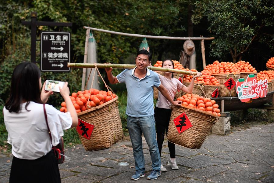 10月3日,游客在西溪國家濕地公園挑起道具“柿子”留影。據(jù)了解,西溪濕地內(nèi)共有柿子樹7000多棵,正值豐收的季節(jié)。 當日是國慶假期第三天,大批游客來到位于杭州的西溪國家濕地公園游玩,在江南詩意的環(huán)境中休閑度假。 新華社記者 黃宗治 攝