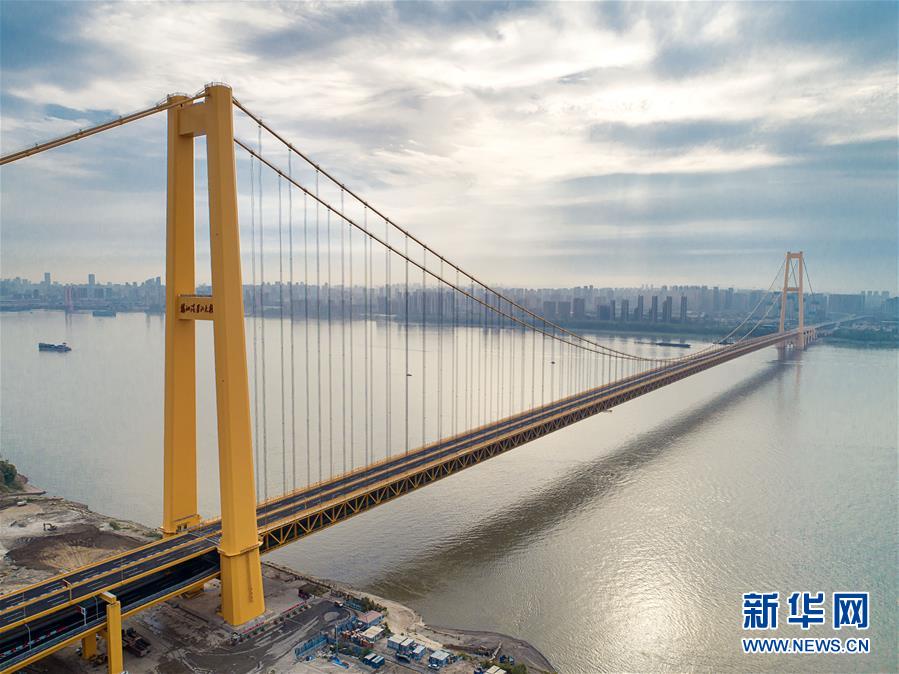 楊泗港大橋建設(shè)創(chuàng)造了多項(xiàng)世界之最:一是主橋跨度達(dá)1700米,為世界上跨度最大的雙層懸索橋;二是主橋設(shè)置雙層雙向12車道,是世界上通行能力最大的公路橋梁;三是大橋主纜設(shè)計張力6.5萬噸,采用了世界上強(qiáng)度等級最高的主纜鋼絲;四是大橋設(shè)置機(jī)動車道、非機(jī)動車道、人行觀光道,集過江交通與觀光于一體,是長江上功能最完備的橋梁。新華社記者熊琦攝