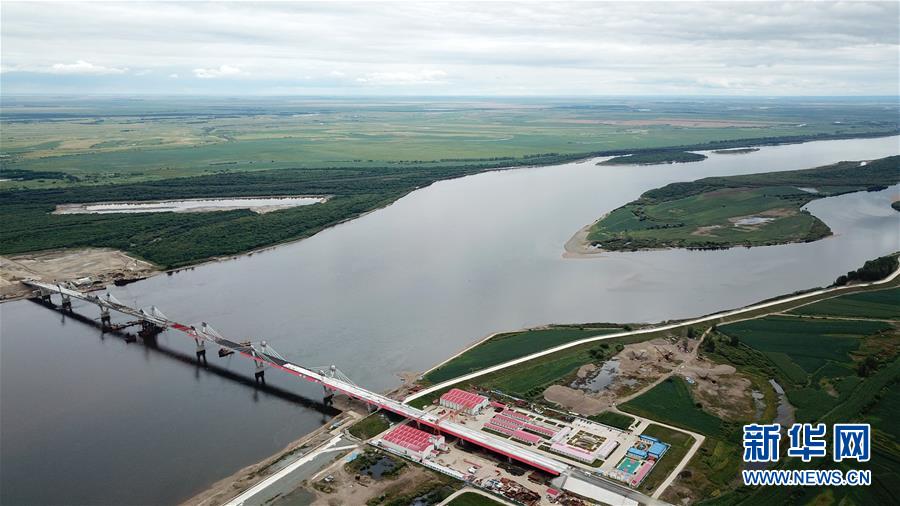 正在進(jìn)行橋面鋪裝施工作業(yè)的黑河到布拉戈維申斯克黑龍江(阿穆爾河)大橋(8月19日無人機(jī)拍攝)。新華社記者 王建威 攝