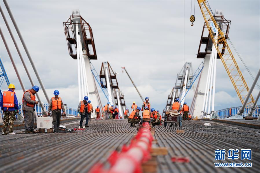 工人在大橋上進(jìn)行橋面鋪裝施工作業(yè)(8月19日攝)。新華社記者 王建威 攝