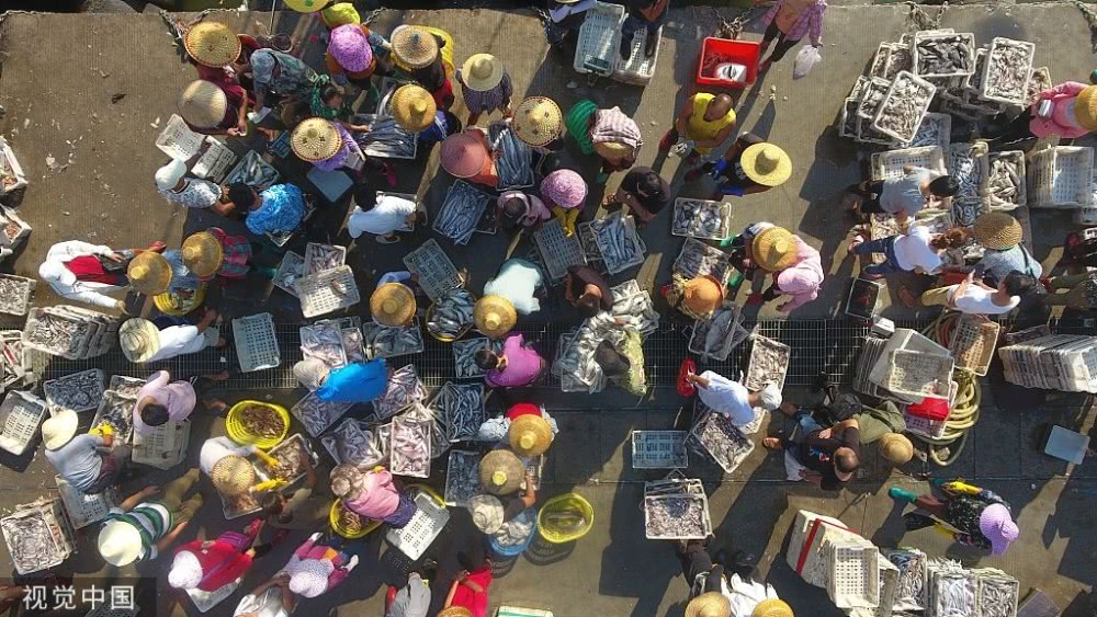 渤海灣畔海產(chǎn)豐收,成群魚蝦分揀后當(dāng)街晾曬,場(chǎng)面賽曬糧食