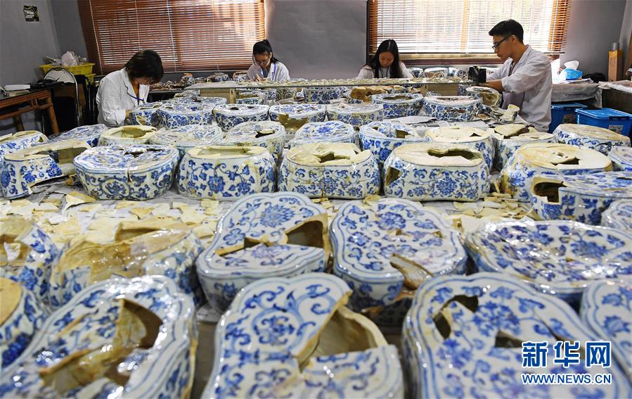 在江西景德鎮(zhèn)御窯廠遺址,工作人員在修復(fù)明代瓷枕(2018年9月20日攝)。新華社記者 萬象 攝