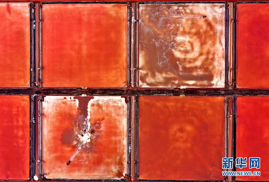 魯北鹽場工人在鹽池中收獲海鹽(10月9日無人機(jī)拍攝)。新華社記者 朱崢 攝
