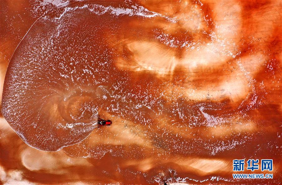 魯北鹽場工人在鹽池中收獲海鹽(10月9日無人機拍攝)。新華社記者 朱崢 攝