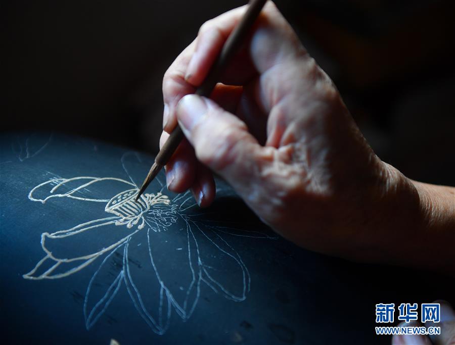 10月12日,丁國坤在家中對一件未成形的脫胎漆器進(jìn)行“彩繪”工序。新華社記者胡晨歡攝