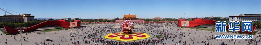 這是10月14日拍攝的天安門廣場(chǎng)中心花壇(全景拼接圖片)。 10月14日,以“花果籃”為主造型的天安門廣場(chǎng)中心花壇吸引了眾多游客參觀拍照?!盎ü@”的夜景更是流光溢彩,絢爛迷人。 新華社記者 殷剛 攝
