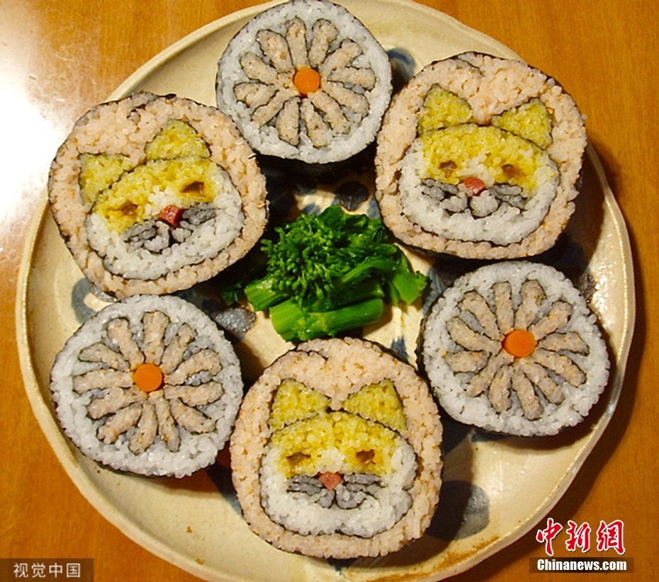 日本壽司廚師利用著色大米和海藻,制作出了貓咪、子宮中的嬰兒、美人魚以及名畫。奇妙的是,不把壽司切成片,就不知道她制作的究竟是什么圖案。圖片來(lái)源:視覺(jué)中國(guó)