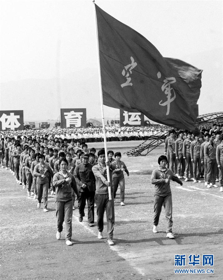 中國人民解放軍第四屆體育運動大會于1979年5月13日在北京隆重開幕。這是空軍運動員在第四屆全軍運動會開幕式上。新華社記者吳森輝攝