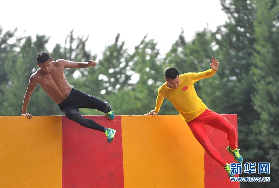 2019年8月5日,八一空軍五項隊隊員王佳在進行障礙跑訓練。新華社記者程敏攝