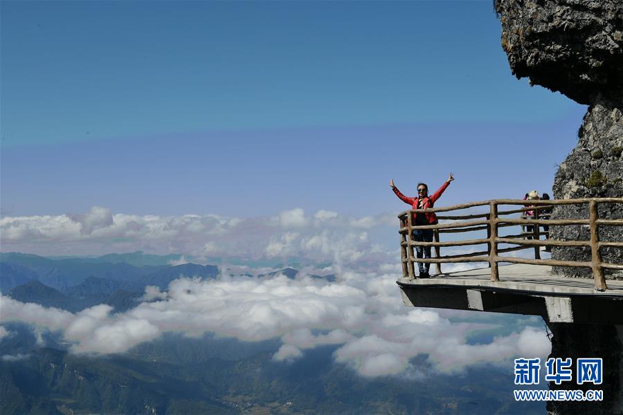 10月17日,游客在漢中市南鄭區(qū)龍頭山風景區(qū)拍照。  陜西省漢中市南鄭區(qū)龍頭山風景區(qū)位于川陜交界處米倉山主梁。龍頭山景區(qū)常年云霧繚繞,宛如仙境,還有奇石、云海、彩林、霧凇等景觀令游客流連忘返。 新華社記者 張博文 攝