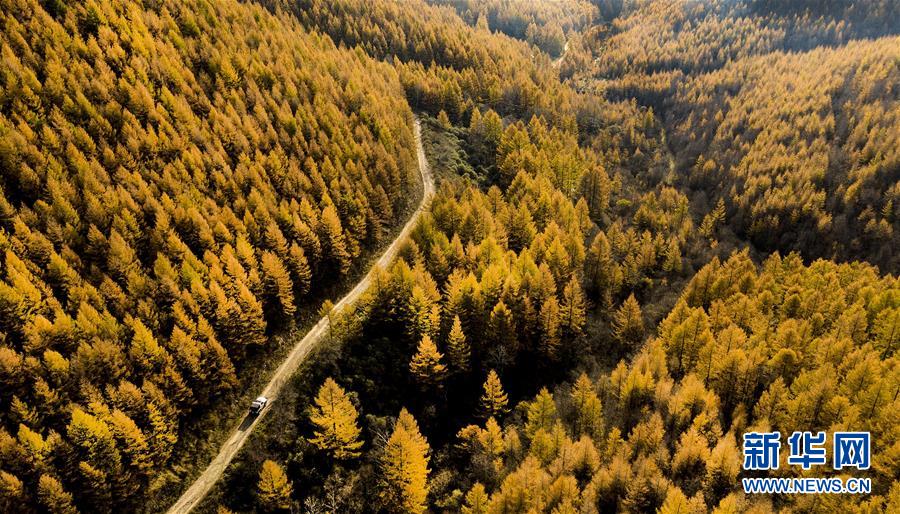 10月8日,一輛汽車(chē)行駛在好地方林場(chǎng)的林間道路上(無(wú)人機(jī)拍攝)。新華社記者陶明攝