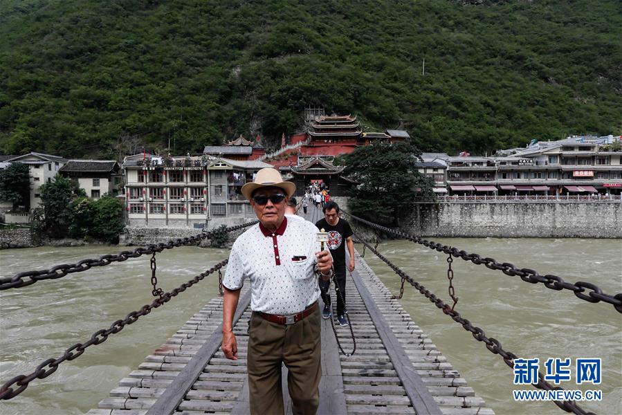 一位當?shù)夭刈謇先私涍^瀘定橋(6月27日攝)。 新華社記者 江宏景 攝