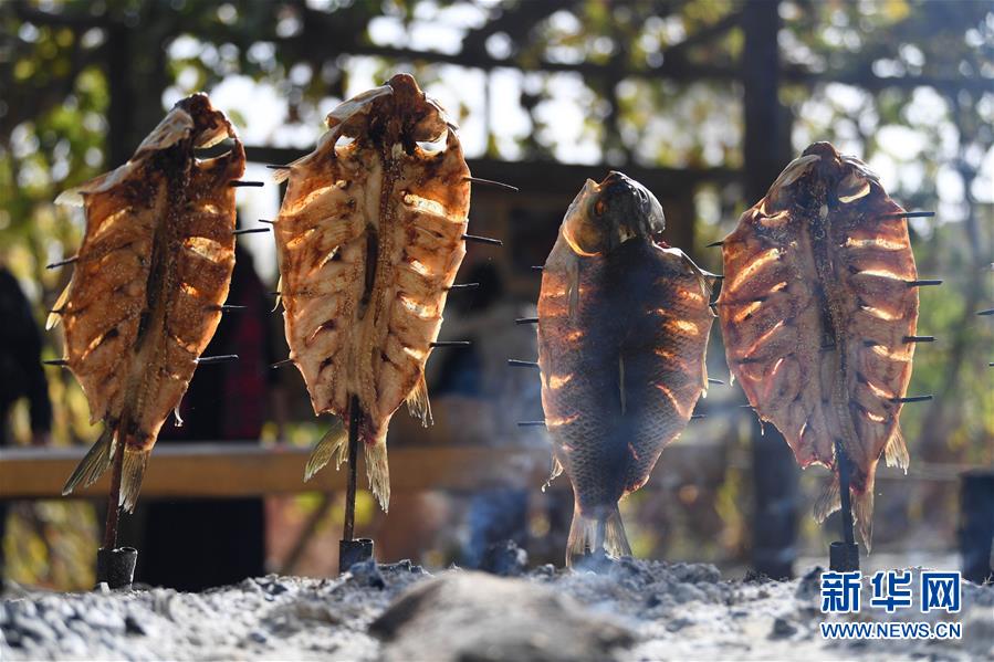 10月26日在新疆阿瓦提縣刀郎部落景區(qū)拍攝的烤魚(yú)。新華社記者沙達(dá)提攝