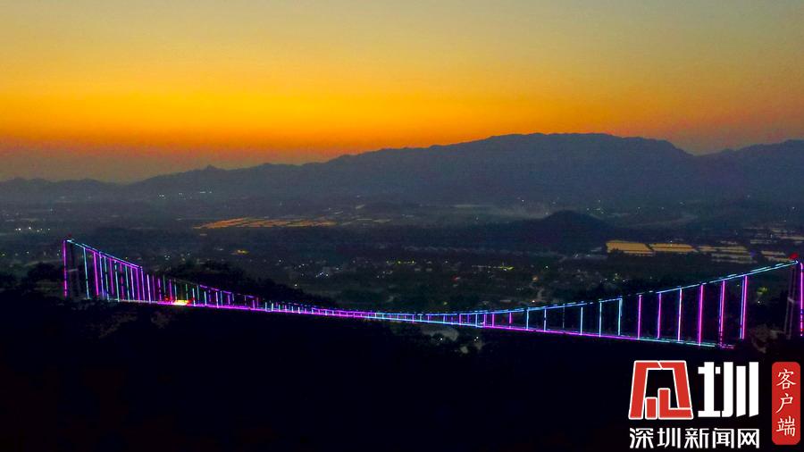 2018年10月7日,廣東佛山。網(wǎng)友紛紛稱佛山南丹山玻璃橋是廣東最美玻璃橋。漸漸地,金燦燦的陽光變?yōu)榱顺赛S色,開始變得柔和,嫵媚動人,給美麗恬靜的群山抹上一層金光。太陽開始脫去華麗的金絲紗裙,換上了橘黃色的時尚。玻璃橋也穿上了端莊典雅的晚禮服,露出那像蒙娜麗莎一樣迷人的笑容。