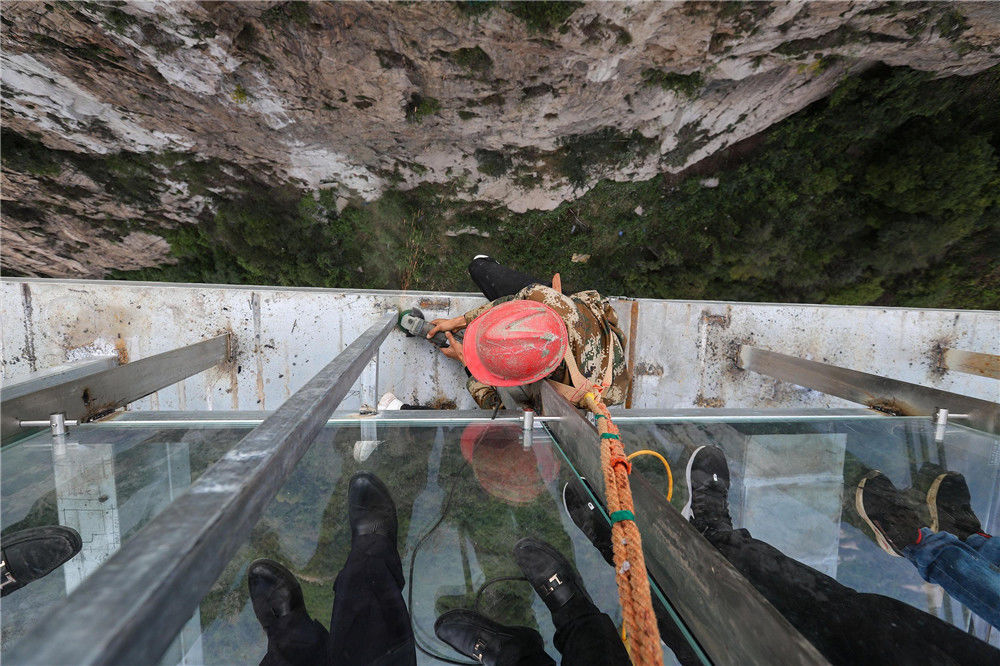 2018年6月28日,廣東清遠古龍峽的玻璃大峽谷,是集玻璃平臺、玻璃棧道、玻璃橋為一體的高空觀光玻璃組合,同時融入了5D破裂效果,并設有玻璃懸廊、玻璃臺階、凌空微步等高空挑戰(zhàn)產(chǎn)品。曾令華/視覺中國