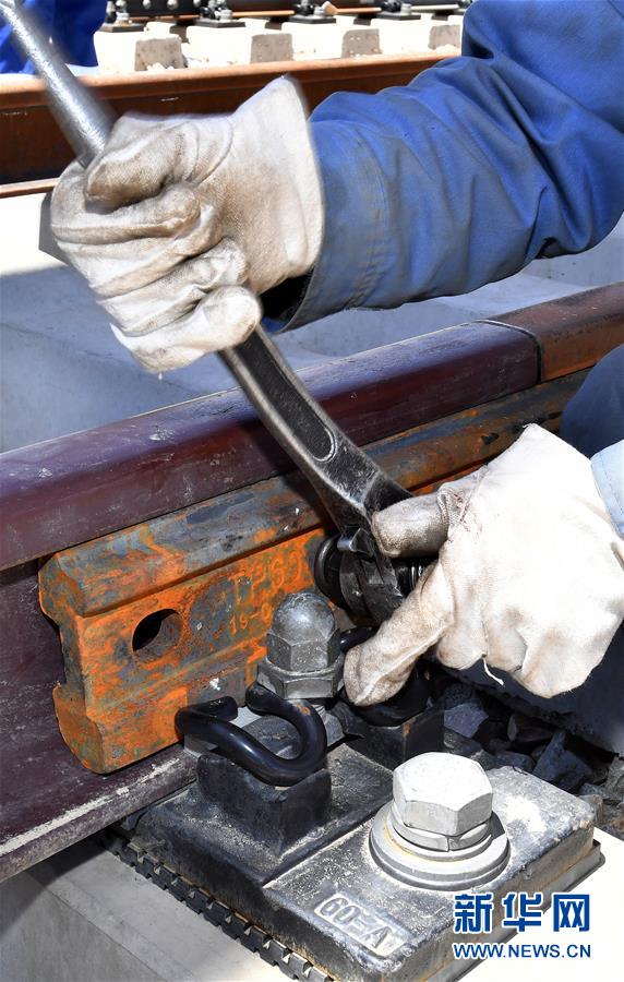 6月6日,負(fù)責(zé)鋪軌的中鐵十一局集團(tuán)的建設(shè)者在現(xiàn)場(chǎng)作業(yè)。新華社記者李鑫攝