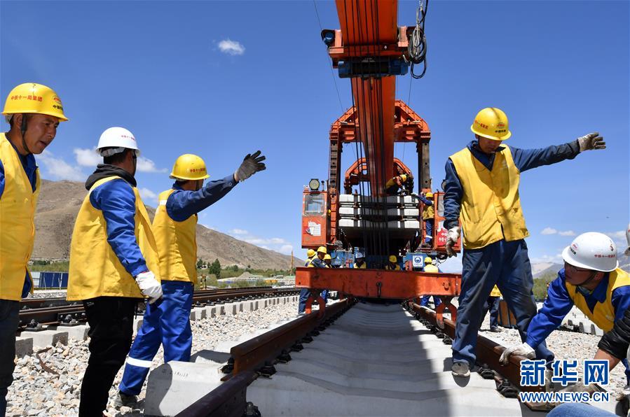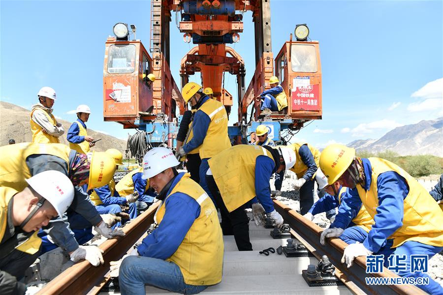 6月6日,負(fù)責(zé)鋪軌的中鐵十一局集團(tuán)的建設(shè)者在現(xiàn)場(chǎng)作業(yè)。新華社記者普布扎西攝