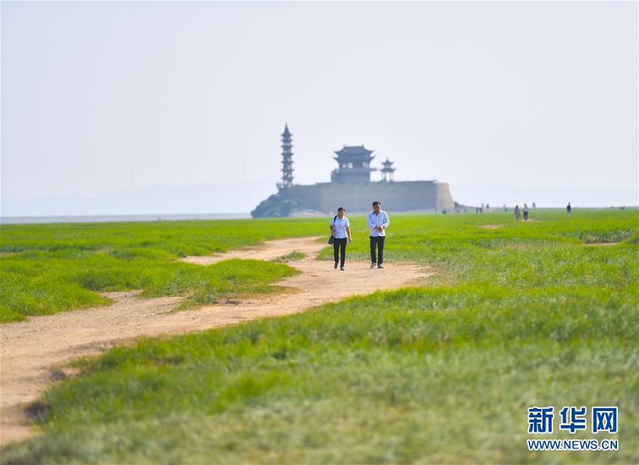 10月9日,江西省廬山市,游客行走在鄱陽湖湖區(qū)干涸的湖面上。新華社記者胡晨歡攝