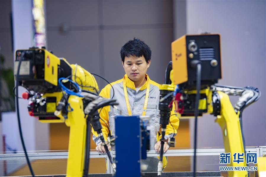 11月5日,在第二屆進(jìn)博會(huì)裝備展區(qū),工作人員在滬工國際(香港)有限公司展臺(tái)前查看點(diǎn)焊機(jī)器人設(shè)備運(yùn)行情況。新華社記者普布扎西攝