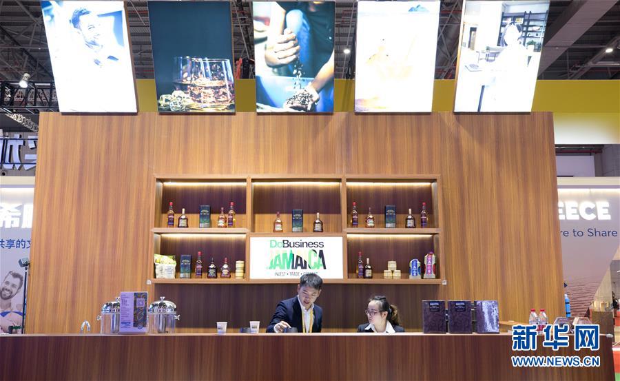 11月5日,工作人員在牙買加國家館整理展品。新華社記者金立旺攝